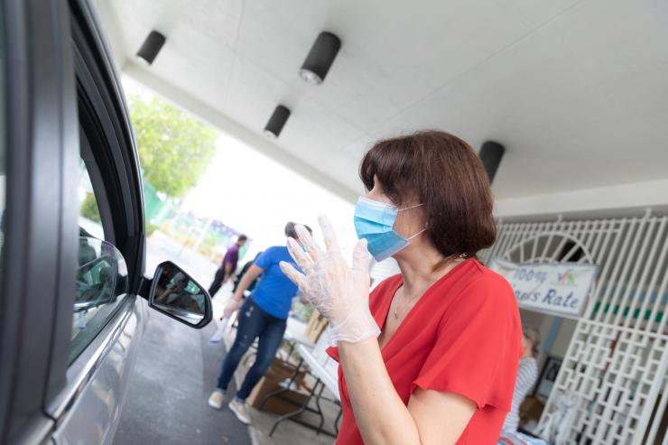 Gladys Palacios, senior director of Child Development Services for Catholic Charities Miami, checks on some 150 vehicles and an estimated 200 households served by the Archdiocese of Miami Catholic Charities food giveaway at the Centro Hispano Catolico Center in Miami April 30, 2020.
