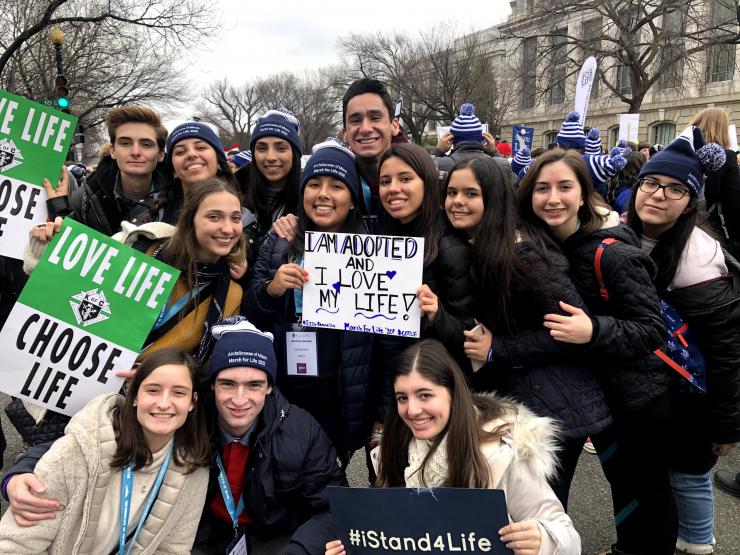 March for Life pilgrims from the Archdiocese of Miami pose with their signs at the start of the March for Life, Jan. 24, 2020.