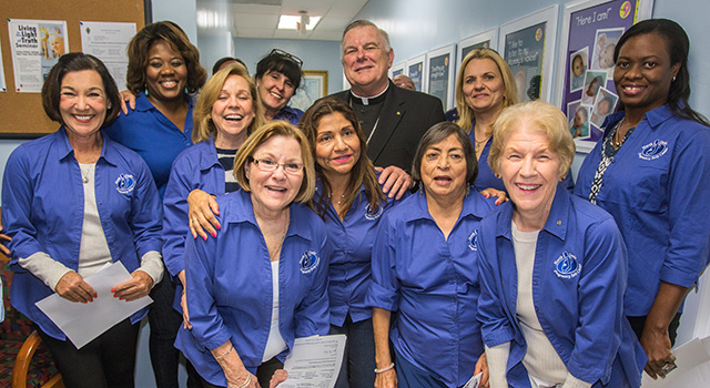 Archbishop Thomas Wenski poses for a photo with Respect Life volunteers after blessing the new offices of the relocated North Dade Pregnancy Help Center in Miami Gardens.