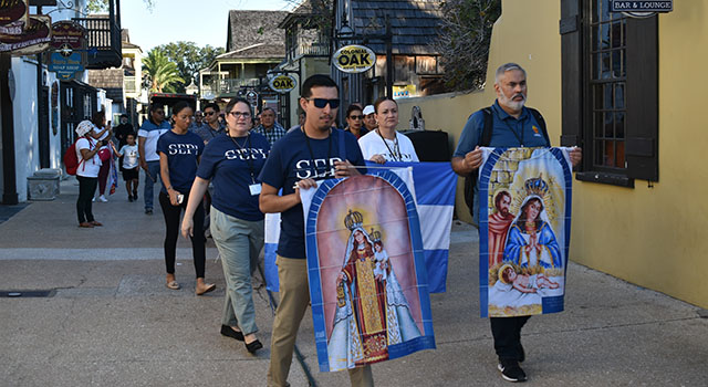 Participantes en el XVIII Encuentro Regional de la pastoral hispana en el sureste de los EE.UU. atraviesan la histórica St. George Street en San Agustín portando banderas y banderines con las advocaciones marianas El Encuentro tuvo lugar del 12 al 15 de octubre de 2022.