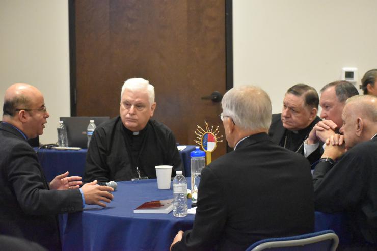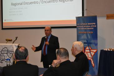 El teólogo Hoffsman Ospino habla con los obispos que asistieron al XVIII Encuentro Regional de la pastoral hispana en el sureste de los EE.UU., que tuvo lugar del 12 al 15 de octubre de 2022 en San Agustín, Florida.