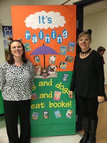 It's raining cats and dogs and great books: Dressed in kitty couture, St. Mark the Evangelist School teacher Danielle McConnel and media specialist Sandy Garcia pose by the door to the library during the Scholastic Book Fair, which later won the school first prize in the Scholastic Spring 2018 National Elementary School Contest.