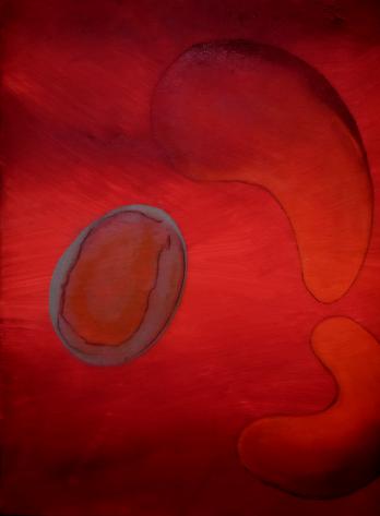 To the untrained eye, though, many of the pictures look like ovals or kidney beans on a flat-colored canvas, outlined in pencil and filled in with acrylic paint. Some are mostly acrylic, resembling green leaves, bluish microbes or red blood cells.