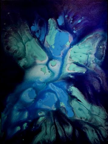 Rodriguez's last two pictures change yet again, with splashes of color devoid of sharp outlines. "Genesis 1" looks like splashing blue-green water. "Genesis 2," in fiery reds, gives an impression of erupting lava.