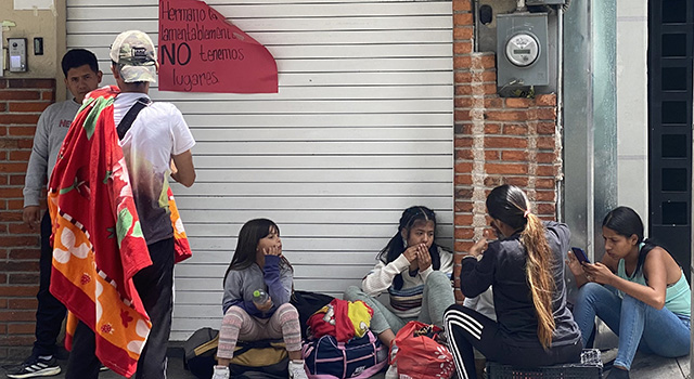 Migrants rest outside the CAFEMIN shelter in Mexico City Aug. 24, 2023, near a sign on the door that says there is no more room inside. With the growing number of migrants heading toward the U.S., shelters along the route from South America to the U.S. southern border are beyond capacity to help. (OSV News/photo/Rhina Guidos, Global Sisters Report)