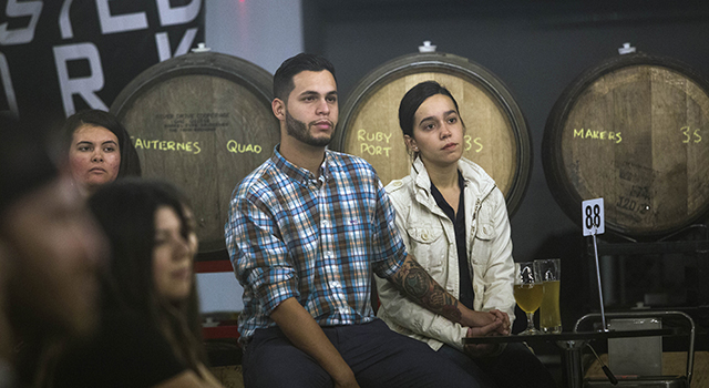 A couple of young adults listen to Archbishop Thomas Wenski during his talk at Theology on Tap, Dec. 20 at The Tank Brewery in Doral.