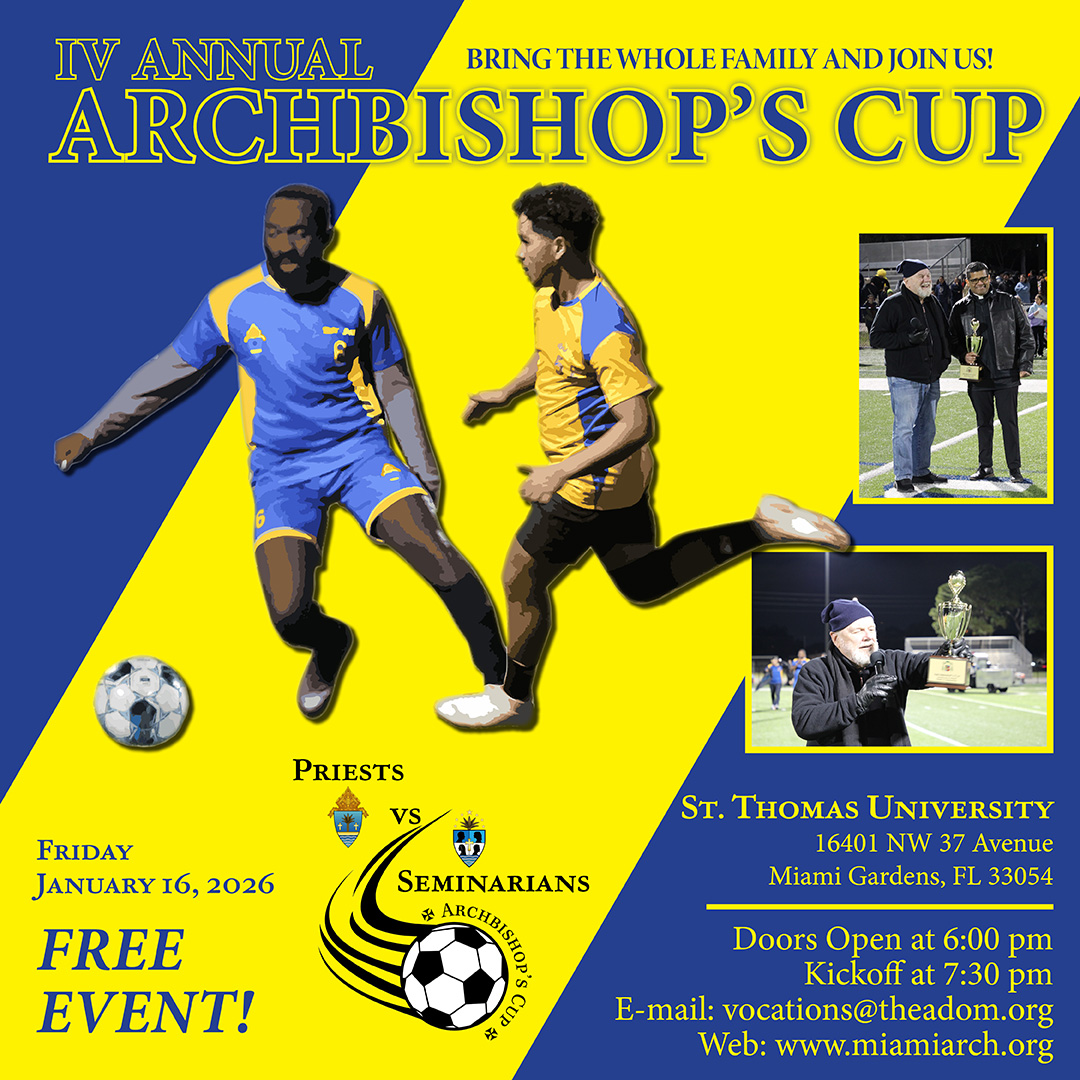 The Archbishop’s Cup is a cherished tradition of the Archdiocese of Miami (ADOM), bringing together our entire Catholic community for an evening of joy, camaraderie, and spirited fun. Each year, our priests and seminarians face off in a lively match, celebrating the special bond between those discerning their vocation and those who have generously dedicated their lives to serving the Church. It’s a wonderful opportunity to witness faith in action, support our future shepherds, and enjoy a night full of laughter and community.