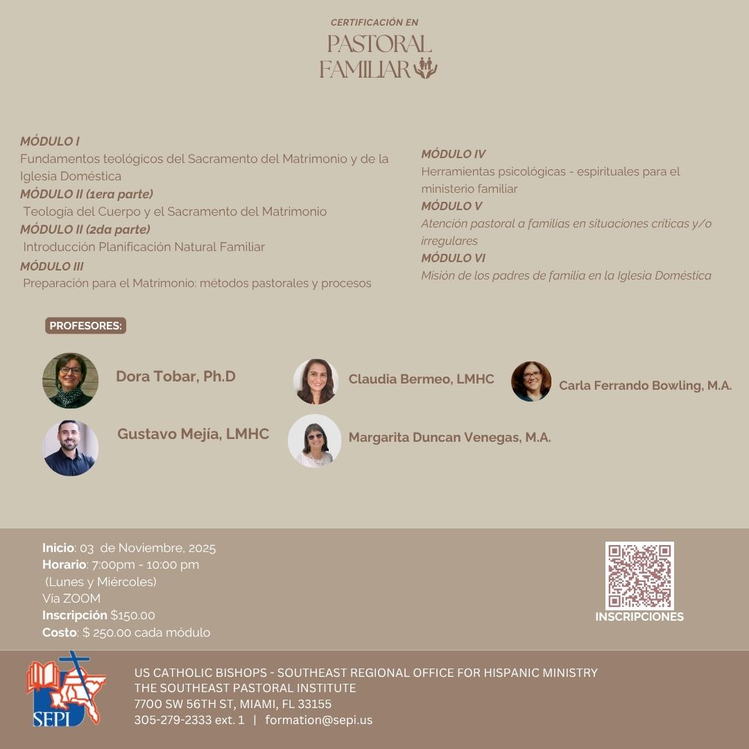 Capacitación en la comprensión de los fundamentos teológicos del Sacramento del Matrimonio y de la Iglesia Doméstica. Manejo de las herramientas pastorales básicas para el acompañamiento de parejas en la preparación para el matrimonio, a los esposos y a las familias en general.