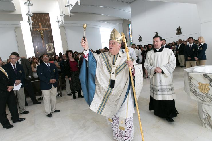 Archbishop Thomas Wenski moves about the church blessing its walls and its people.