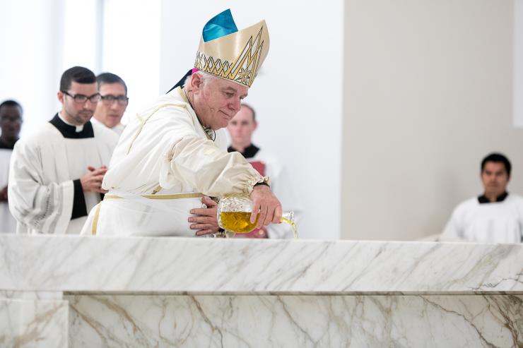 Archbishop Thomas Wenski pours oil of chrism on the altar during the rite of anointing.