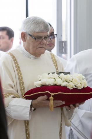 Deacon Ray Ortega, one of Our Lady of Guadalupe's first parishioners, enters the church carrying the relic that will be placed under the altar. He no longer lives in Doral but helps out at the church whenever he's in town. (ANA RODRIGUEZ-SOTO | FC)