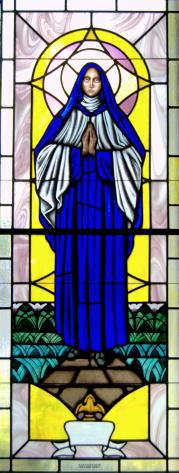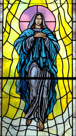 Immaculate Conception window in the chapel of St. Thomas Aquinas High School, Fort Lauderdale. The Catholic Church teaches that Mary was conceived without original sin so that she could bear Jesus.