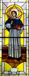 St. Thomas Aquinas window in the chapel of the Fort Lauderdale high school named for him. This rendering casts him in a typical pose, with a book and a quill pen.