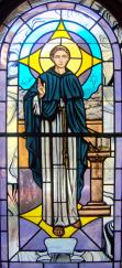St. Dominic rests a hand on a Bible and a rosary in this window at the chapel of St. Thomas Aquinas High School, Fort Lauderdale. Aquinas chose Dominic's Order of Preachers, although his family tried to force him to join the Benedictines.