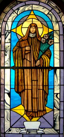 St. Therese de Lisieux joins hands in prayer in this window at the chapel of St. Thomas Aquinas High School, Fort Lauderdale. She was nicknamed The Little Flower for her teachings on the "little way" of trust and gentleness.
