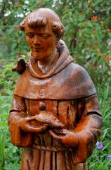 Statue of St. Patrick smiles amid a garden at St. Thomas Aquinas High School. The statue isn't weeping -- this photo followed a shower.