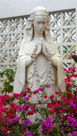 Mary prays the rosary amid bromeliads at St. Thomas Aquinas High School. The statue is believed to be the same one set up at the school in 1957.