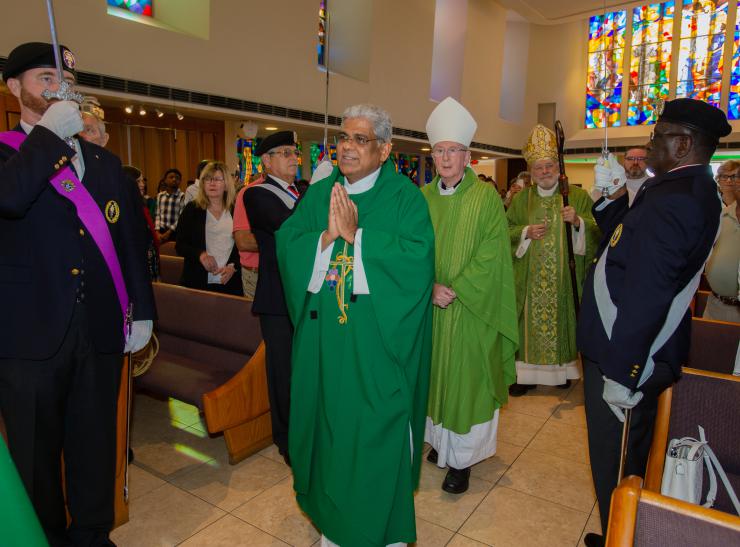 Father George Packuvettithara, front, pastor of St. Rose of Lima in Miami Shores, enters the church with Bishop John Noonan of Orlando, center, and Archbishop Thomas Wenski, for the Mass closing the parish's 75th anniversary celebration, Oct. 15, 2023.