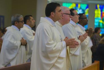 Priests who serve or have served at St. Rose of Lima Parish over the years take part in the Mass closing the parish's 75th anniversary celebration, Oct. 15, 2023. From rear, left: Father Gary De Los Santos, a former parishioner, Father Antonio Tupiza, Msgr. Michael Souckar, Msgr. Gregory Wielunski, Father Carlos Vega and Father Emmanuel Essiet.