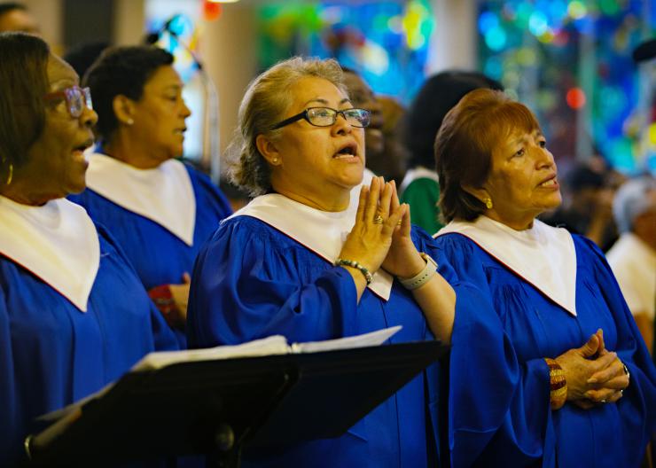 Choir members, from left, Pearl Grant, Alejandrina Tabor, and Janeth Delgado, sing during the Mass closing St. Rose of Lima Parish's 75th anniversary celebration, Oct. 15, 2023.