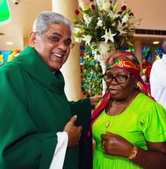 Father George Packuvettithara, pastor, is congratulated by parishioner Jean Francois at the conclusion of the Mass closing St. Rose of Lima Parish's 75th anniversary celebration, Oct. 15, 2023.