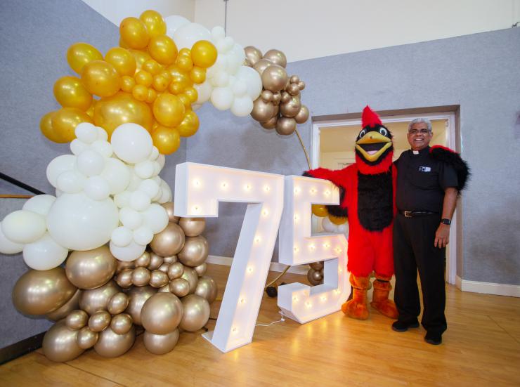 Father George Packuvettithara, pastor, poses with the school mascot, a cardinal, after the Mass closing St. Rose of Lima Parish's 75th anniversary celebration, Oct. 15, 2023. Under the costume: Nico Barreiros, 14, a graduate of St. Rose of Lima School who now attends St. Thomas Aquinas High School in Fort Lauderdale.