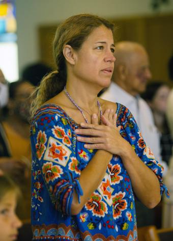 A St. Rose of Lima parishioner prays during the Mass closing the parish's 75th anniversary celebration, Oct. 15, 2023.