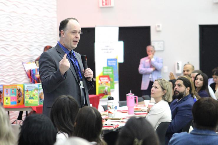 Jim Rigg, superintendent of Catholic schools for the Archdiocese of Miami, speaks at the New Teacher Orientation hosted at Monsignor Edward Pace High, in Miami Gardens, on Aug. 4, 2025. About 250 new teachers participated in the half-day event organized by the Office of Catholic Schools.