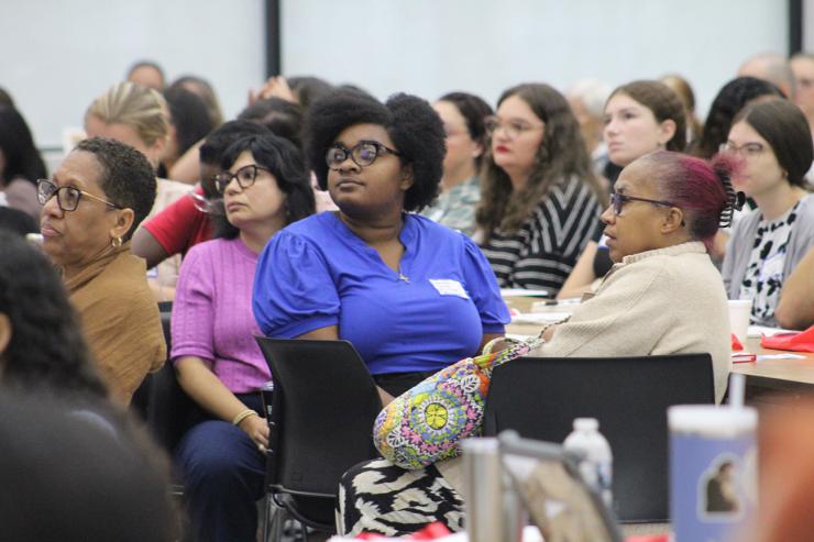 Teachers listen during a presentation at the New Teacher Orientation hosted at Monsignor Edward Pace High, in Miami Gardens, on Aug. 4, 2025. About 250 new teachers participated in the half-day event organized by the Office of Catholic Schools.
