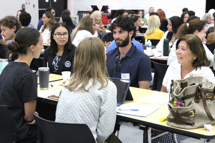 Teachers share their perspectives during a group activity at this year's New Teacher Orientation. Hosted at Monsignor Edward Pace High, in Miami Gardens, on Aug. 4, 2025, about 250 new teachers participated in the half-day event organized by the Office of Catholic Schools.