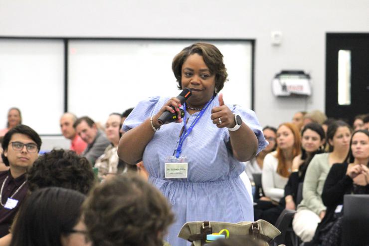LaTonya White, associate superintendent for teaching and learning in the Office of Catholic Schools for the Archdiocese of Miami, gives teachers a thumbs-up during her presentation at the New Teacher Orientation on August 4, 2025, held at Monsignor Edward Pace High in Miami Gardens.