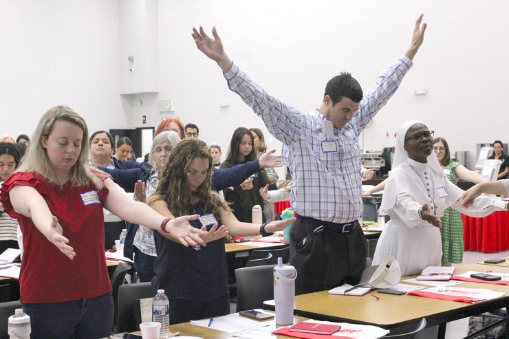 New teachers raise their arms during an activity at the New Teacher Orientation on August 4, 2025, held at Monsignor Edward Pace High in Miami Gardens, organized by the Office of Catholic Schools.