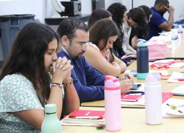 New teachers take a moment to pray and reflect at the New Teacher Orientation on August 4, 2025, held at Monsignor Edward Pace High in Miami Gardens, organized by the Office of Catholic Schools.