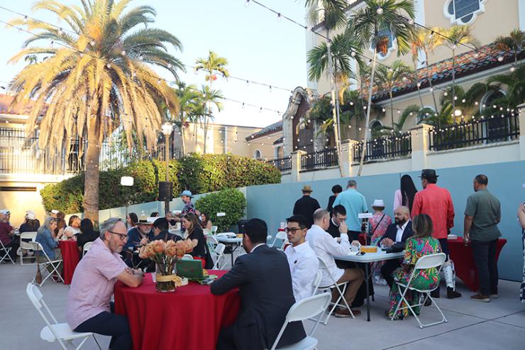 Some attendees at “Havana Nights,” a fundraising event for Catholic Charities’ Unaccompanied Minors Program, enjoy playing dominoes and chatting March 26, 2026, in the courtyard of St. Mary Cathedral in Miami.