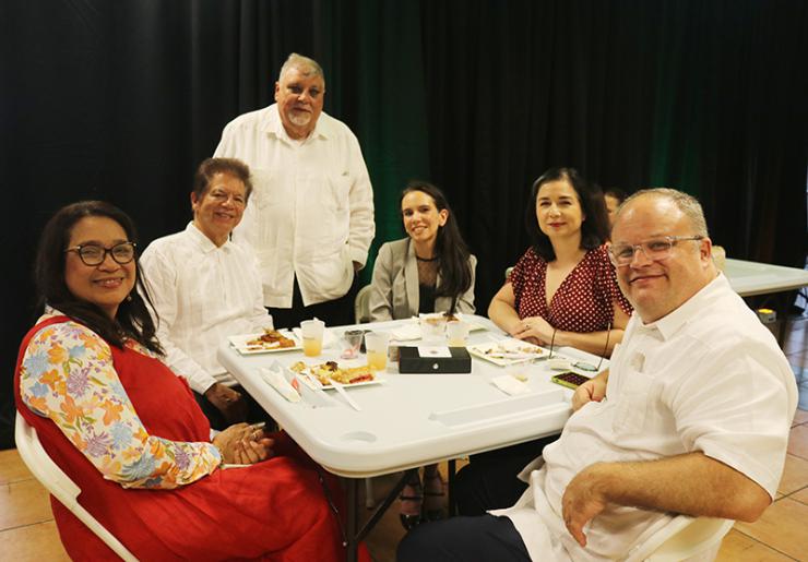 Enjoying Havana Nights are, from left, Father Elvis Gonzalez, pastor of St. Michael the Archangel Church in Miami; Alfredo and Lucy Piña; Msgr. Roberto Garza, director of Radio Paz 830 AM; and Peter Routsis-Arroyo, executive director of Catholic Charities of the Archdiocese of Miami. The annual fundraiser for Catholic Charities' Unaccompanied Minors Program took place March 26, 2026, at St. Mary Cathedral’s courtyard in Miami.
