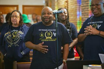 Robert Brown (center) sings with the choir during the 75th anniversary Mass of Holy Redeemer Church in Miami celebrated by Archbishop Thomas Wenski on Dec. 14, 2025. On the occasion, Father Emmanuel Essiet was installed as pastor.