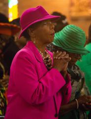 Bernadette Poitier, religious education director, prays during Mass