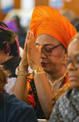DECEMBER 14, 2025 Marlene Quaroni/FC Bernadette Poitier, religious education director, prays during Mass Archbishop Thomas Wenski celebrated a 75th anniversary Mass at Holy Redeemer Church and installed Father Emmanuel John Essiet as pastor